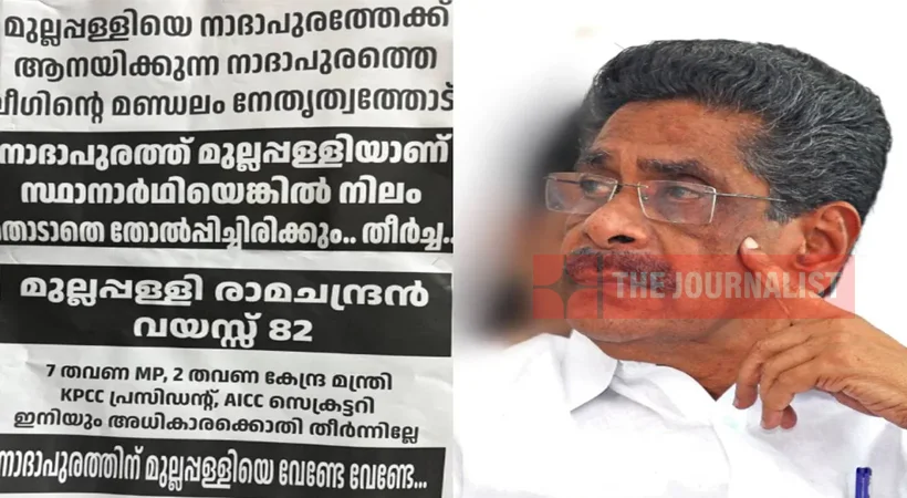 ‘ഏഴ് തവണ എംപി, രണ്ട് തവണ കേന്ദ്രമന്ത്രി, കെപിസിസി പ്രസിഡന്റ്, എഐസിസി സെക്രട്ടറി—ഇനിയും അധികാരക്കൊതി തീർന്നില്ലേ’ എന്ന വിമർശനവും പോസ്റ്ററുകളിൽ ഉണ്ട്. നിയമസഭാ തെരഞ്ഞെടുപ്പിൽ മത്സരിക്കാനുള്ള നീക്കങ്ങൾ സജീവമാകുന്നതിനിടെ, അഴിയൂരിൽ നേരത്തെയും മുല്ലപ്പള്ളി രാമചന്ദ്രനെതിരെ സമാനമായ പോസ്റ്ററുകൾ പ്രത്യക്ഷപ്പെട്ടിരുന്നു. ‘മുല്ലപ്പള്ളി ഇനി വിശ്രമജീവിതം നയിക്കട്ടെ’ എന്ന ആവശ്യമുയർത്തിയതിന് പിന്നാലെയാണ് നാദാപുരത്തും പോസ്റ്ററുകൾ വീണ്ടും ഉയർന്നിരിക്കുന്നത്.
