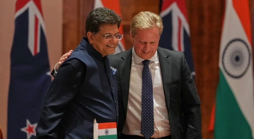 ഇന്ത്യയും ന്യൂസിലൻഡും നിർണായകമായ സ്വതന്ത്ര വ്യാപാരക്കരാറിൽ ഒപ്പുവച്ചു. കേന്ദ്ര വാണിജ്യമന്ത്രി പീയൂഷ് ഗോയലും ന്യൂസിലൻഡ് വ്യാപാരമന്ത്രി ടോഡ് മക്ലേയുമാണ് കരാറിൽ ഒപ്പുവെച്ചത്. അടുത്ത അഞ്ച് വർഷത്തിനുള്ളിൽ ഉഭയകക്ഷി വ്യാപാരം 500 കോടി ഡോളറായി ഉയർത്തുകയാണ് കരാറിന്റെ പ്രധാന ലക്ഷ്യം.